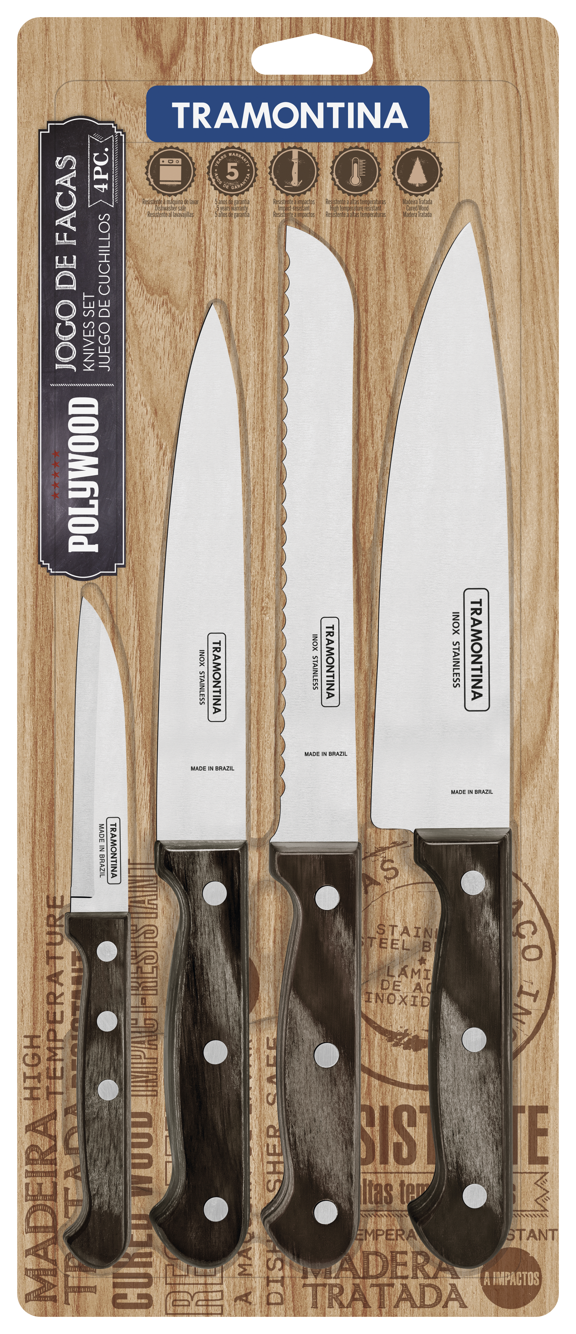 El juego de cuchillos Tramontina Polywood de 4 piezas es la elección ideal para quienes buscan rendimiento, durabilidad y elegancia en la cocina. Diseñado para acompañar tanto el uso diario como momentos especiales, combina materiales de alta calidad con un acabado sofisticado que aporta valor a cualquier espacio culinario.