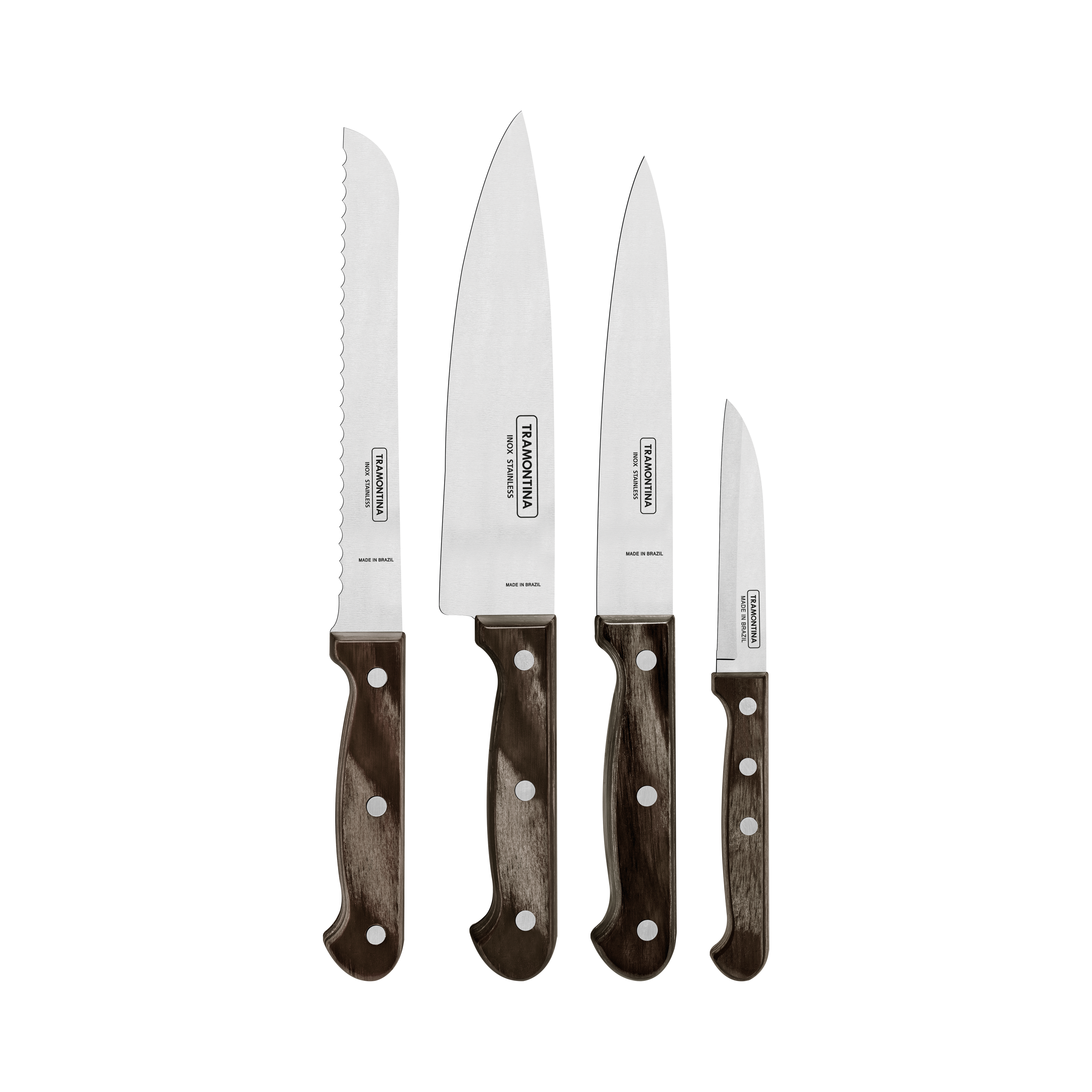 El set incluye un cuchillo para verduras y frutas de 9 cm, un cuchillo de cocina de 15 cm, un cuchillo chef de 18 cm y un cuchillo para pan de 18 cm, cubriendo las principales necesidades del día a día en la cocina. Su diseño ergonómico proporciona un manejo equilibrado y seguro, pensado para un uso prolongado y una larga vida útil.