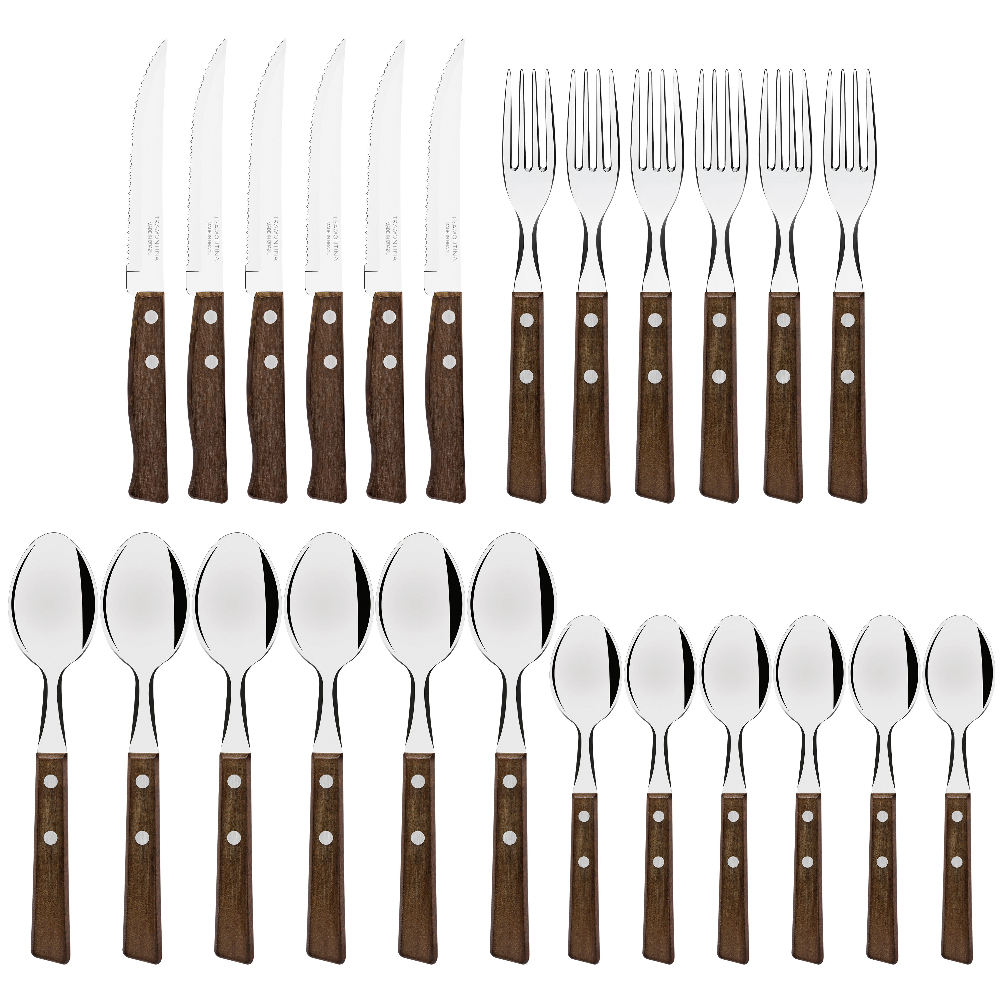 Para añadir una atmósfera rústica a su mesa y a todas sus comidas, cuente con el juego de cubiertos Tramontina Tradicional con hojas en acero inoxidable y mangos de madera natural de 24 piezas. Ideales para acompañar durante el día a día, posee piezas con hojas de acero inoxidable, donde los cuchillos garantizan un excelente poder de corte y los tenedores y cucharas tienen estampado y espesor especiales que los hacen más resistentes. ¡Los mangos son de madera y harán su mesa más tradicional y llena de estilo!
