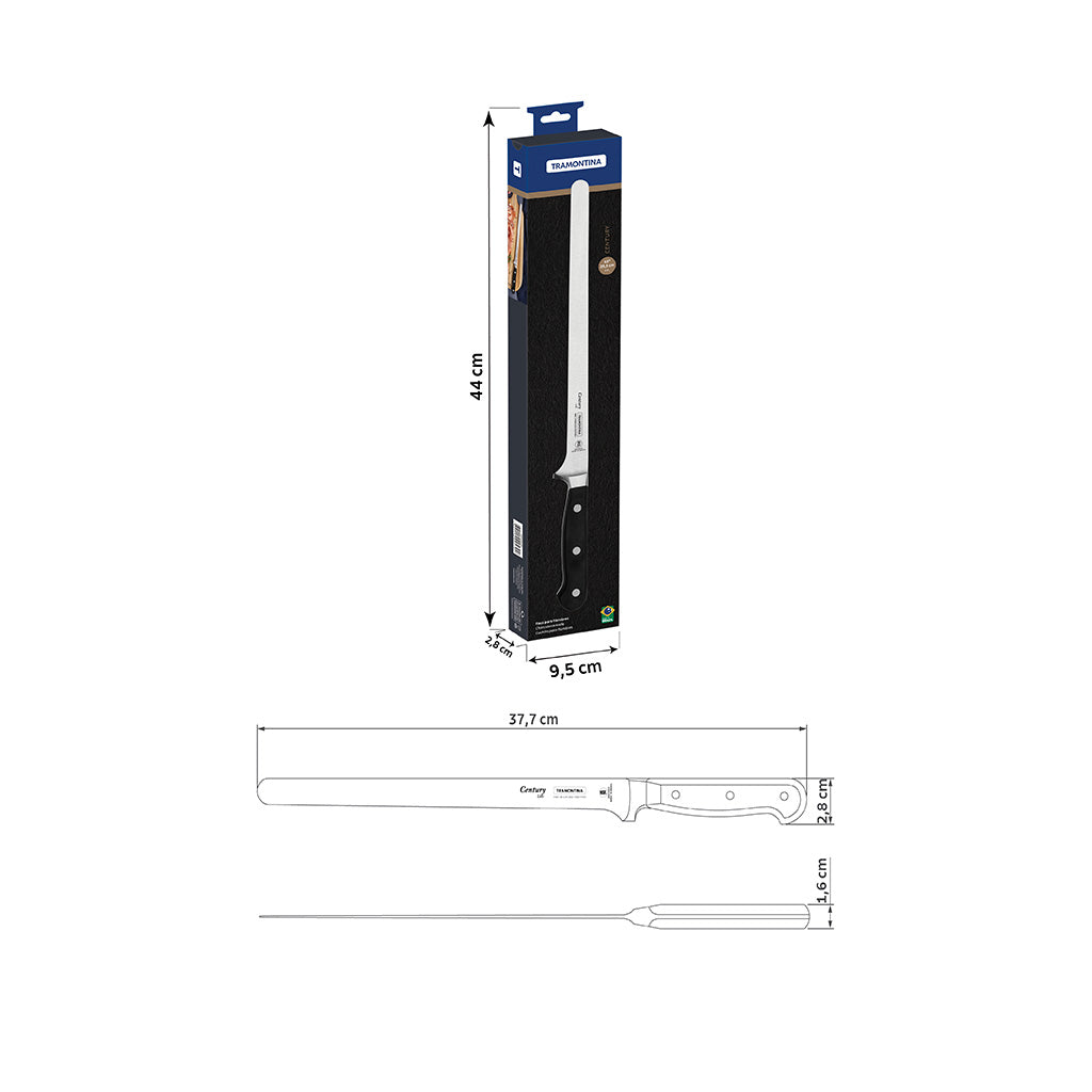 El cuchillo jamonero Tramontina Century con hoja en acero inoxidable y mango en policarbonato y fibra de vidrio de 10 pulgadas es perfecto para los amantes de la cocina que buscan la combinación ideal entre desempeño y estilo. Con su hoja forjada en acero inoxidable especial, este cuchillo asegura un filo duradero y preciso.