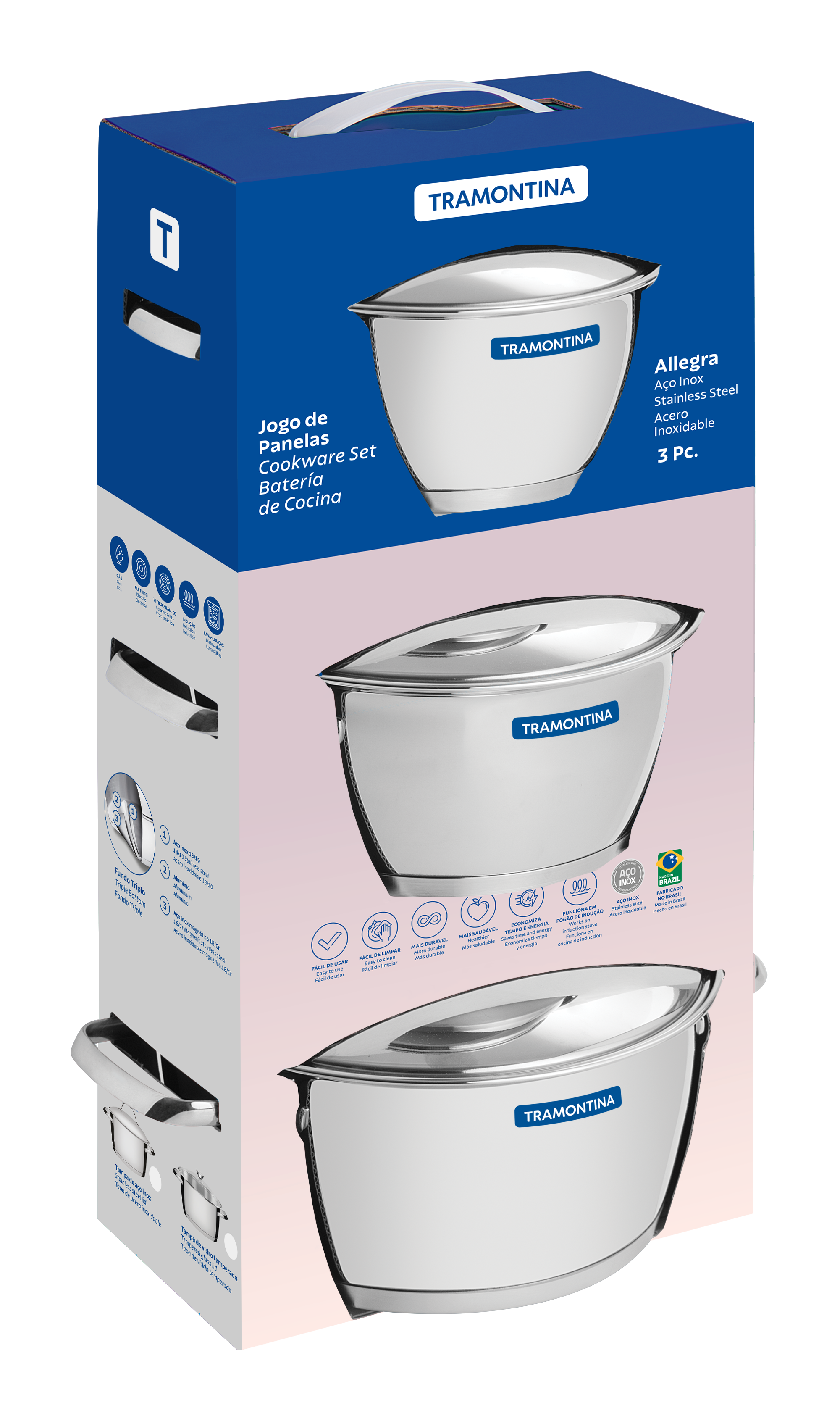 La batería de cocina Allegra de acero inoxidable con fondo triple y tapas de acero inoxidable 3 piezas Tramontina hará que su cocina sea aún más completa! Hechas totalmente de acero inoxidable, las tres piezas tienen fondo triple (acero inoxidable + aluminio + acero inoxidable), característica que distribuye el calor de forma uniforme, proporcionando una cocción más rápida y manteniendo los alimentos calientes durante más tiempo, además de ahorrar más energía.
